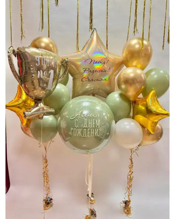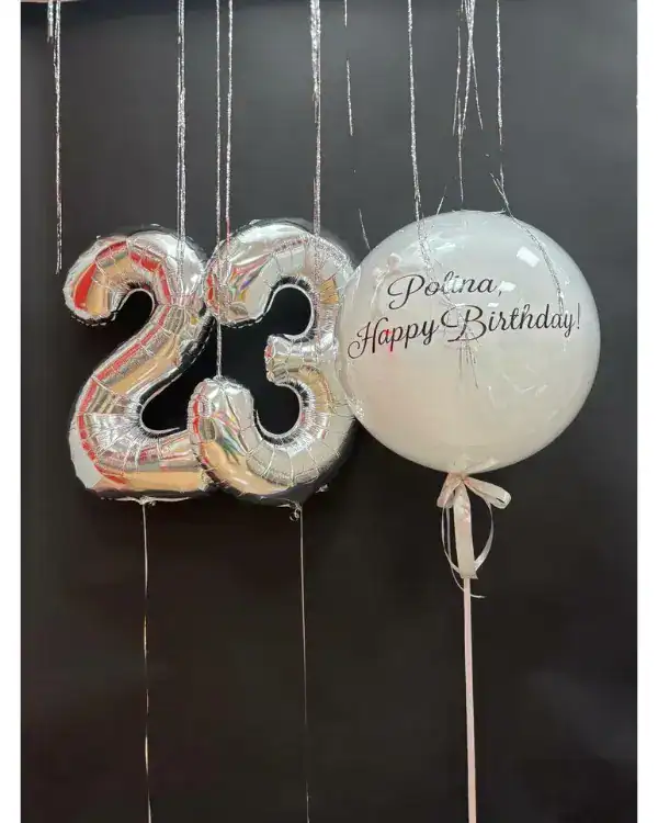 - Крупный размер — около 60 см. Стоимость составляет примерно 2200 рублей. Этот размер позволяет размещать большие надписи, фотографии, использовать широкие ленты, фатин и мини-фигурки.