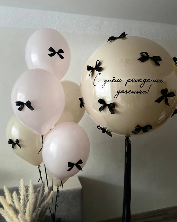 - Крупный размер — около 60 см. Стоимость составляет примерно 2200 рублей. Этот размер позволяет размещать большие надписи, фотографии, использовать широкие ленты, фатин и мини-фигурки.